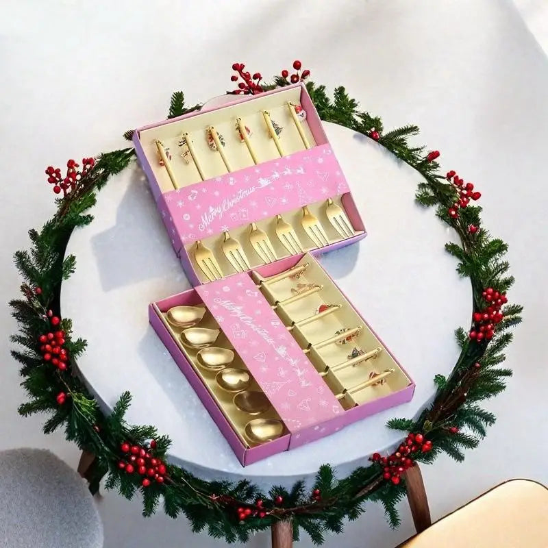 6PCS Christmas Spoons Coffee Cutlery Set Stainless Steel Cutlery Set Dessert Spoon Forks Christmas Gifts Elk Christmas Decoratio